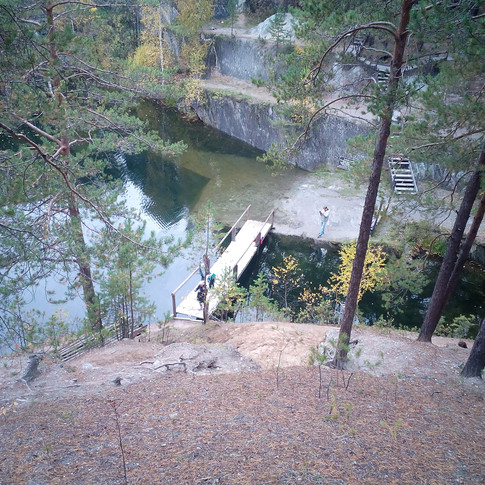 Вволю налюбовавшись открывающимся видом, спустились к карьеру. Побегали по мостику, попили чай, отдохнув на скамейке, и с новыми силами решили продолжить променад, обойдя озеро по верху, по периметру. Пожалуй, это была самая захватывающая часть прогулки. Карабкались на скалы, цепляясь за камни и ветки, огибали выступы, заглядывали, затаив дыхание, вниз...В общем, путь оказался под силу всем участникам нашего похода.